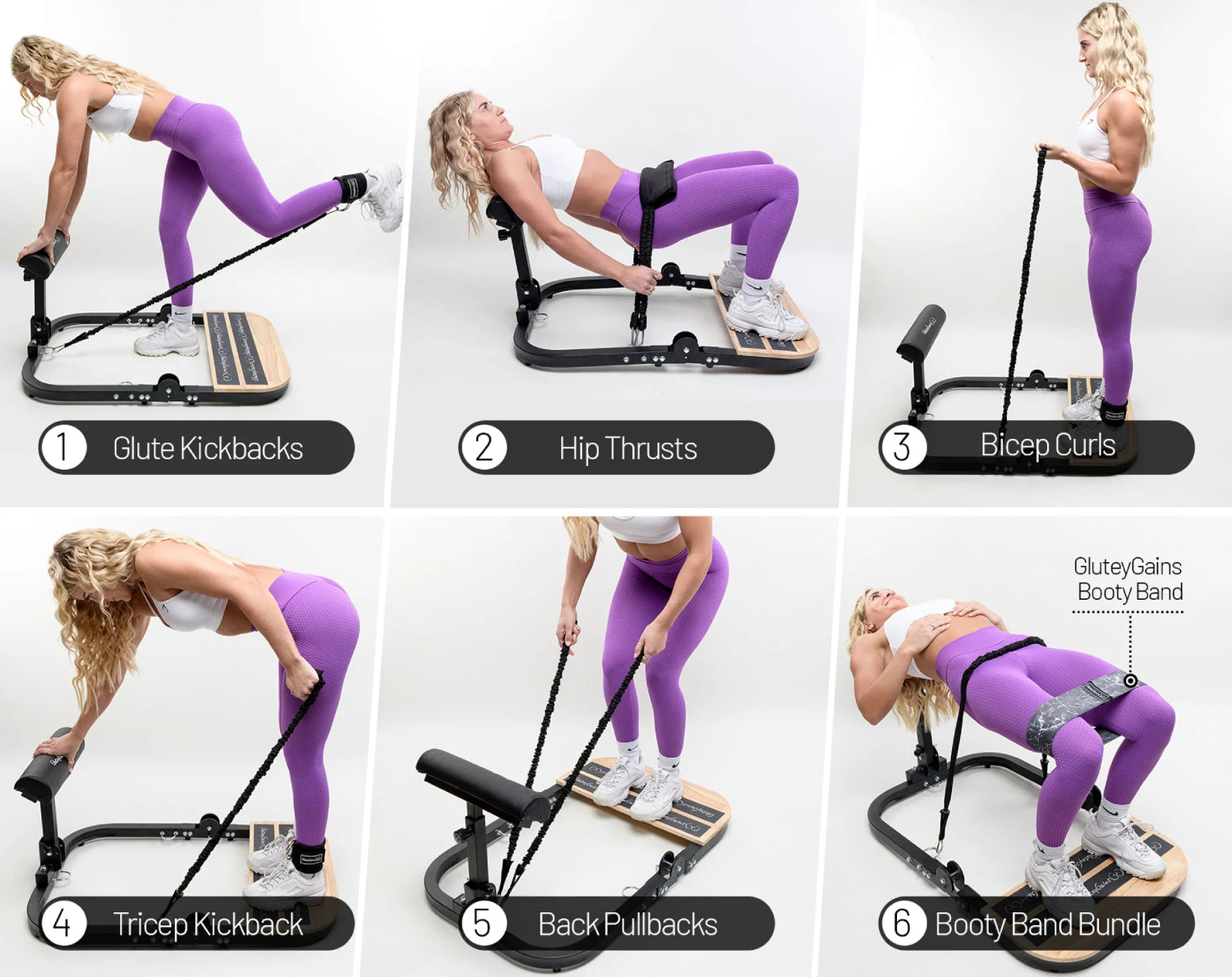 GluteyGains is your complete home gym, offering limitless possibilities for total-body transformation. With our all-in-one design and exclusive bundle, you can sculpt your booty and work your legs and upper body with 30+ exercises, all in the comfort of your own space